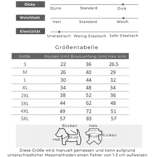 Bitte miss den Brustumfang und die Rückenlänge deines Hundes, um die richtige Größe zu wählen.